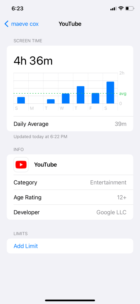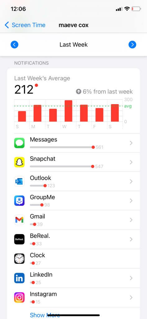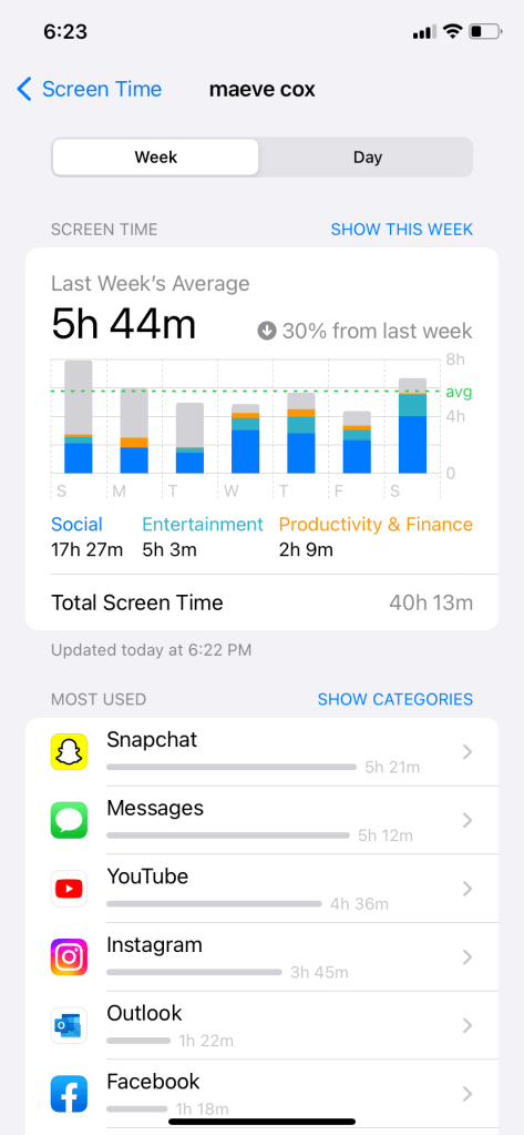 Through Apple’s screen time features I have solidified my knowledge about the dependency I have on my phone. Despite deleting Tik Tok my daily screen time average was five hours and forty-five minutes. This is 30% down from the week I had Tik Tok downloaded. So, I did meet my goal of decreasing my average screen time.