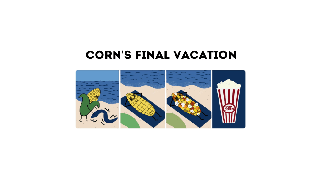 In October 2024 I took a visual storytelling course and drew this three act story of a piece of corn becoming popcorn. The visual story can help encourage young kids to wear sunscreen while at the beach or it could be made into a popcorn advertisement at a movie theater. I utilized the program Adobe Fresco.