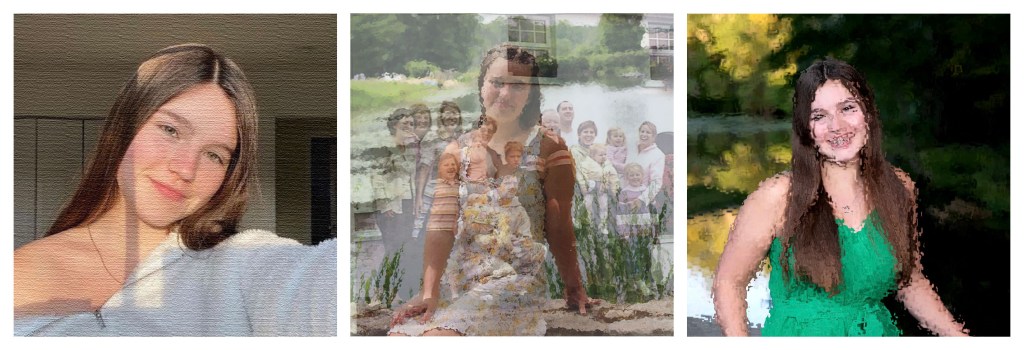 For this project I picked three of my favorite photos of myself, which I edited to represent different aspects of my self identity. I began with a 150 ppi resolution photoshop letter document, and set a 6in by 6in guide layout with .25 margins and gutters. Each photo used was cropped to be 6in by 6 inches at 150 ppi in a separate tab than the final layout. Starting from the left box I chose a simple phot that doesn’t have too much detail, I applied a canvas filter which represents my artistic side. Next, the middle image was altered with a frosted glass filter to blur the details on my dress as well as the background. Secondly I blended a family picture, from when I was around 2yrs old, that represents my Irish heritage and name by right clicking next to the layers name. In order to bring the blended image to the final project, I used the shortcut command A to select the work and then command shift C to copy all its layers. Finally the last image was taken at the country club I used to attend, I applied the water ripple filter to represent the summer days I spent there. In all this project was fun and allowed me to experiment with the different filters available in photoshop.